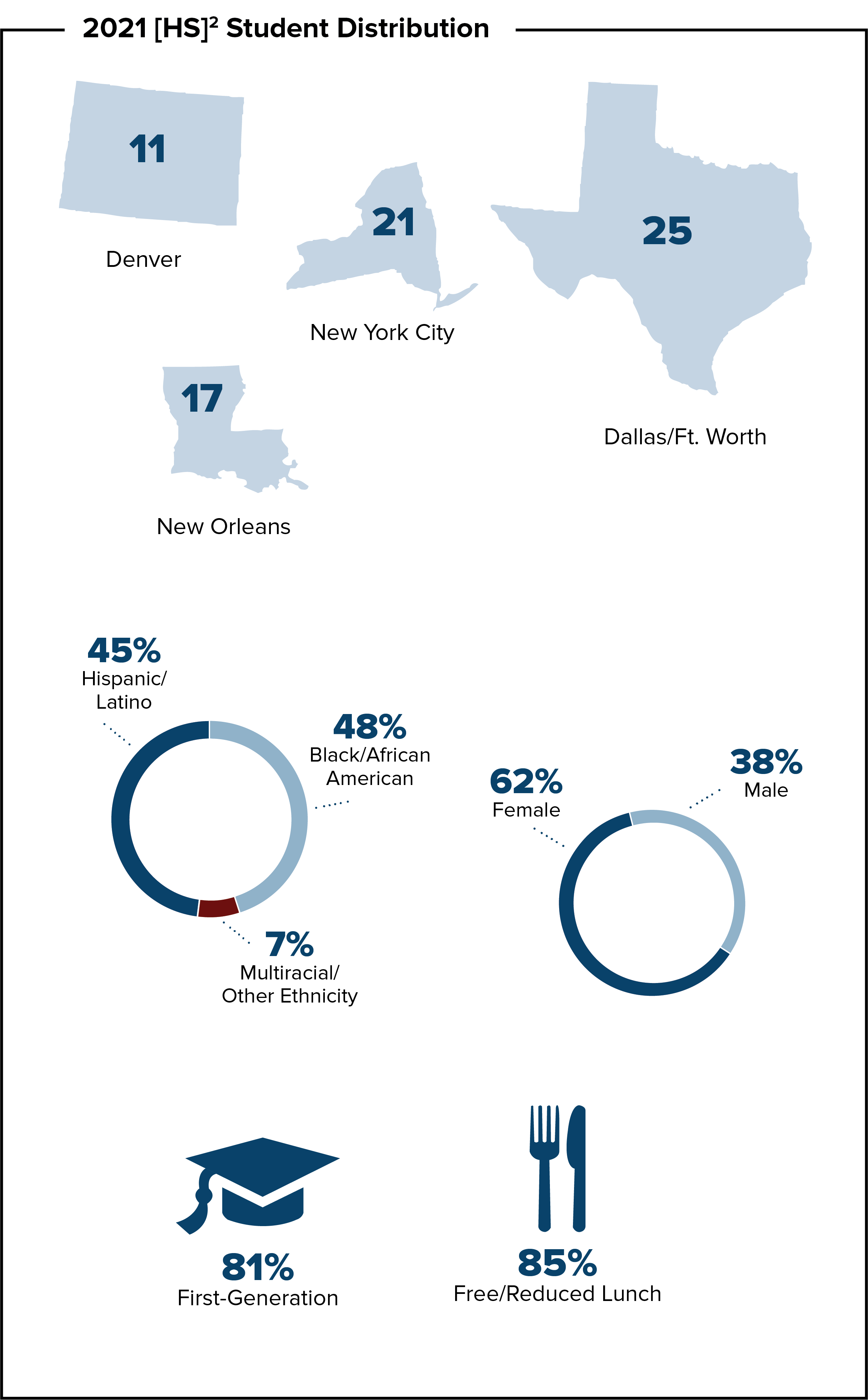 (HS)2 is a STEM-based, college access program for first-generation and/or low-income students. Students come from public and charter schools in New York City, Denver, Fort Worth, and New Orleans, and attend (HS)2 at no cost.